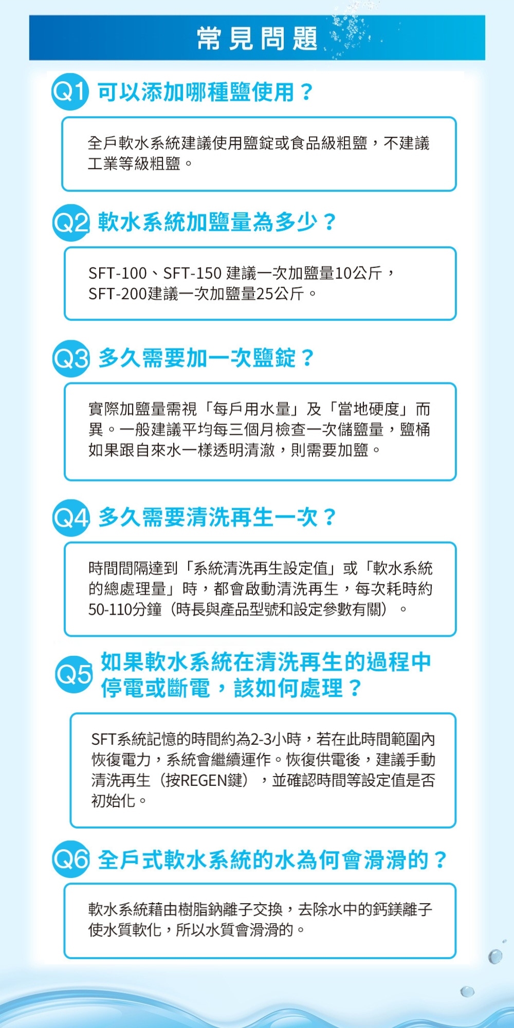 | 注意事項 | 鹽錠添加頻率因水質硬度、用水量、樹脂再生週期而有所差異。 |