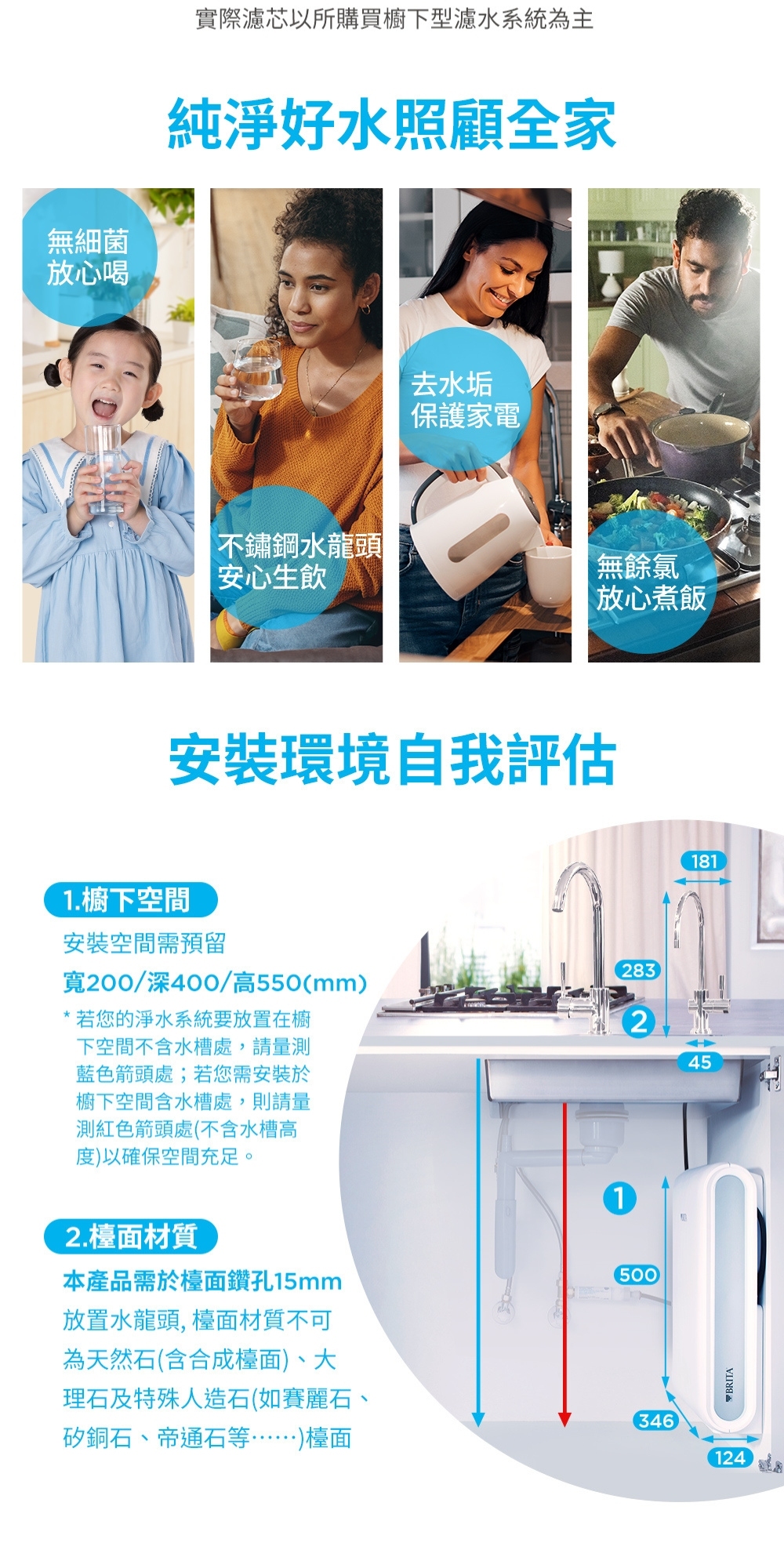 | 注意事項 | 即使濾芯處理水量未達上限,為避免濾材生菌數超標,最慢 12 個月需更換一次。 |