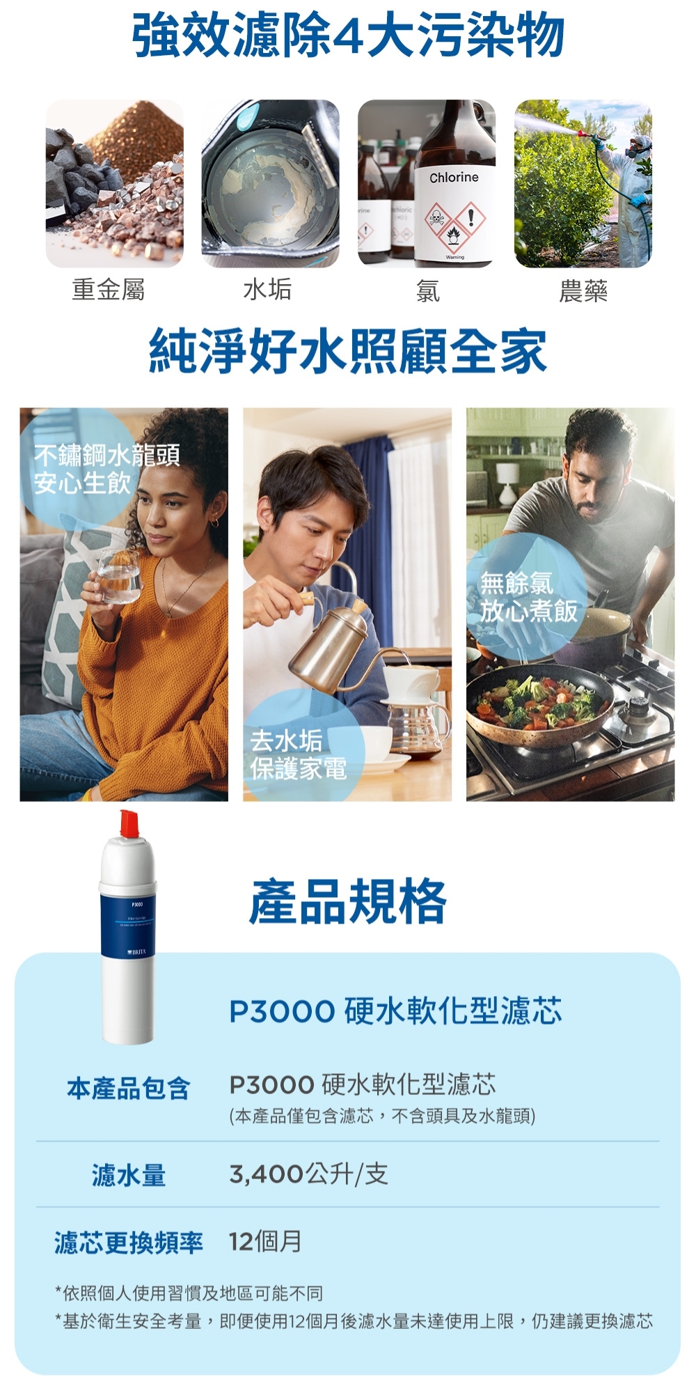 | 注意事項 2 | 即使濾芯處理水量未達上限,為避免濾材生菌數超標,最慢 12 個月需更換一次。 |