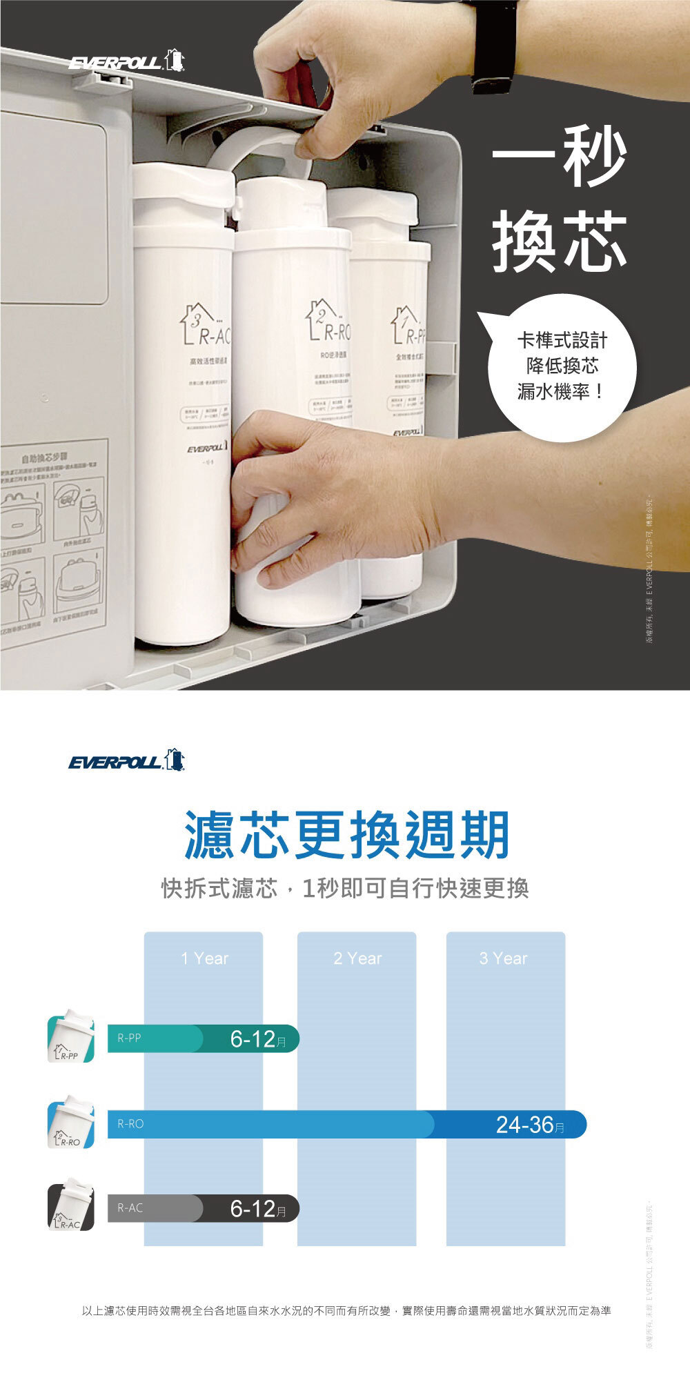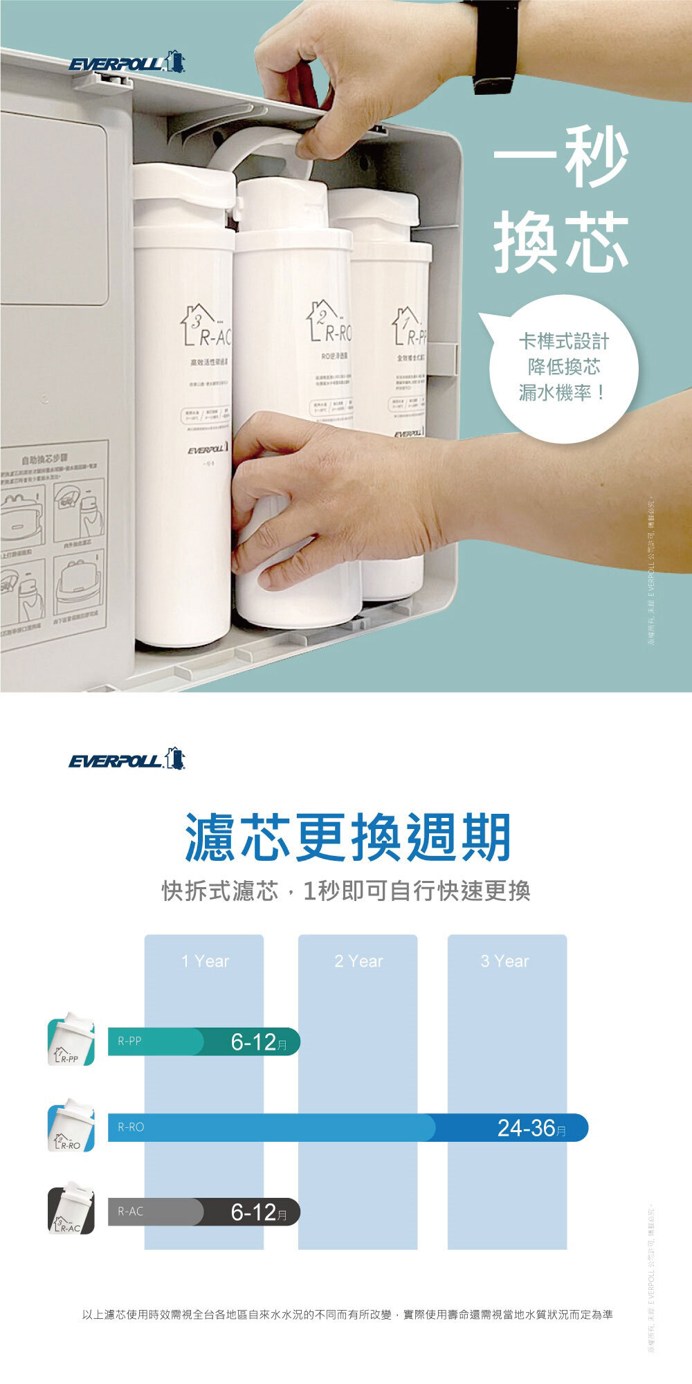 | 注意事項 2 | 若處理水量未達使用上限,為避免濾芯內部滋菌,建議每 12~24 個月更換一次。 |
