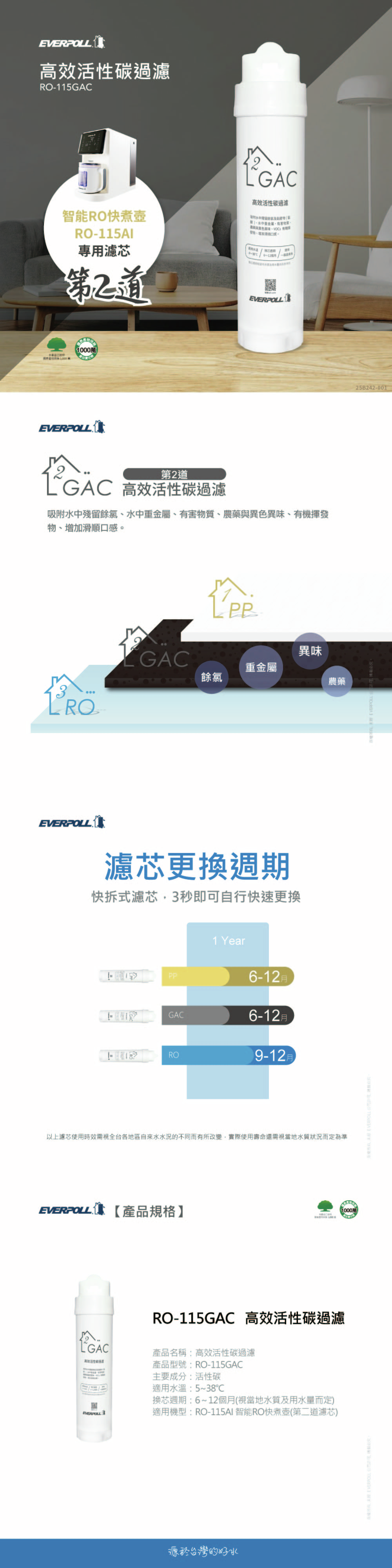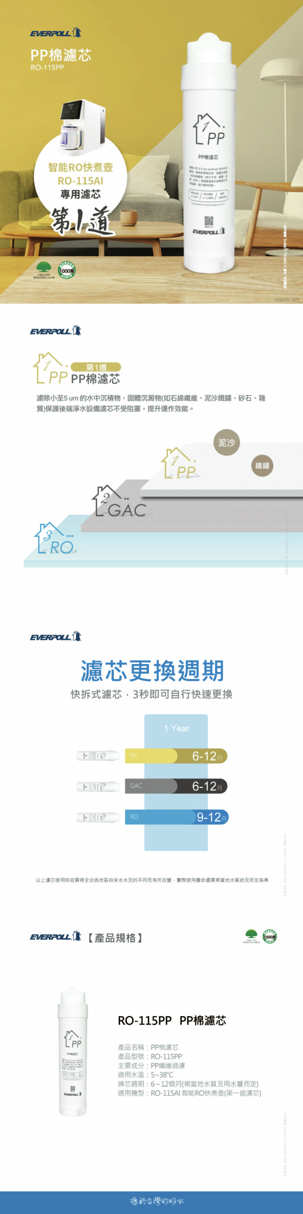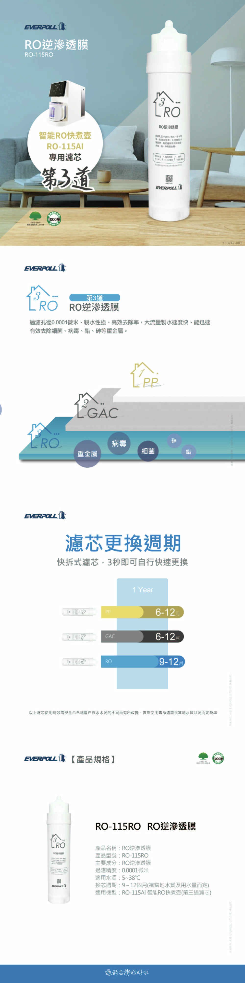 | 更換週期 | RO-115PP 6~12 個月|RO-115GAC 6~12 個月|RO-115RO 9~12 個月 |