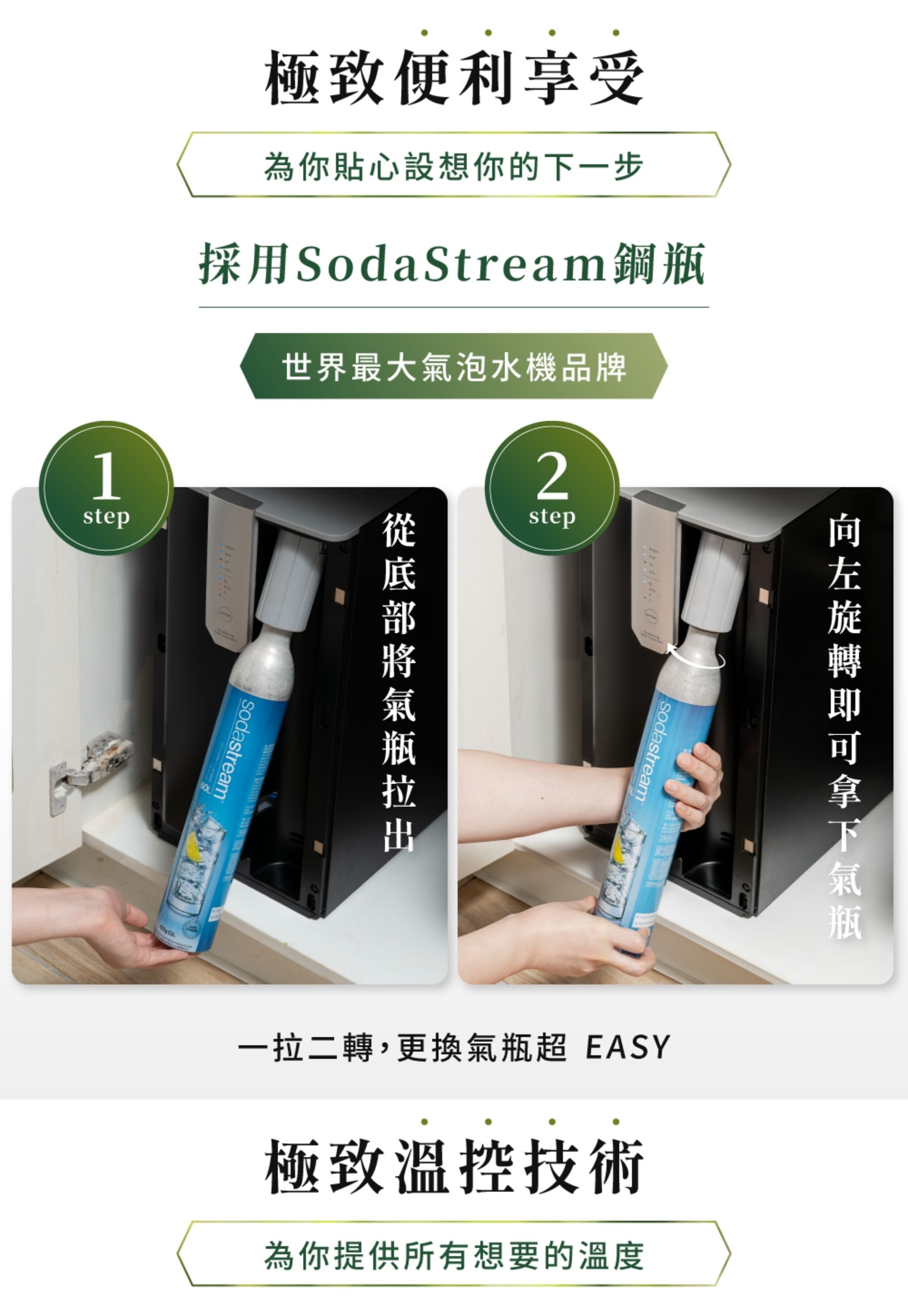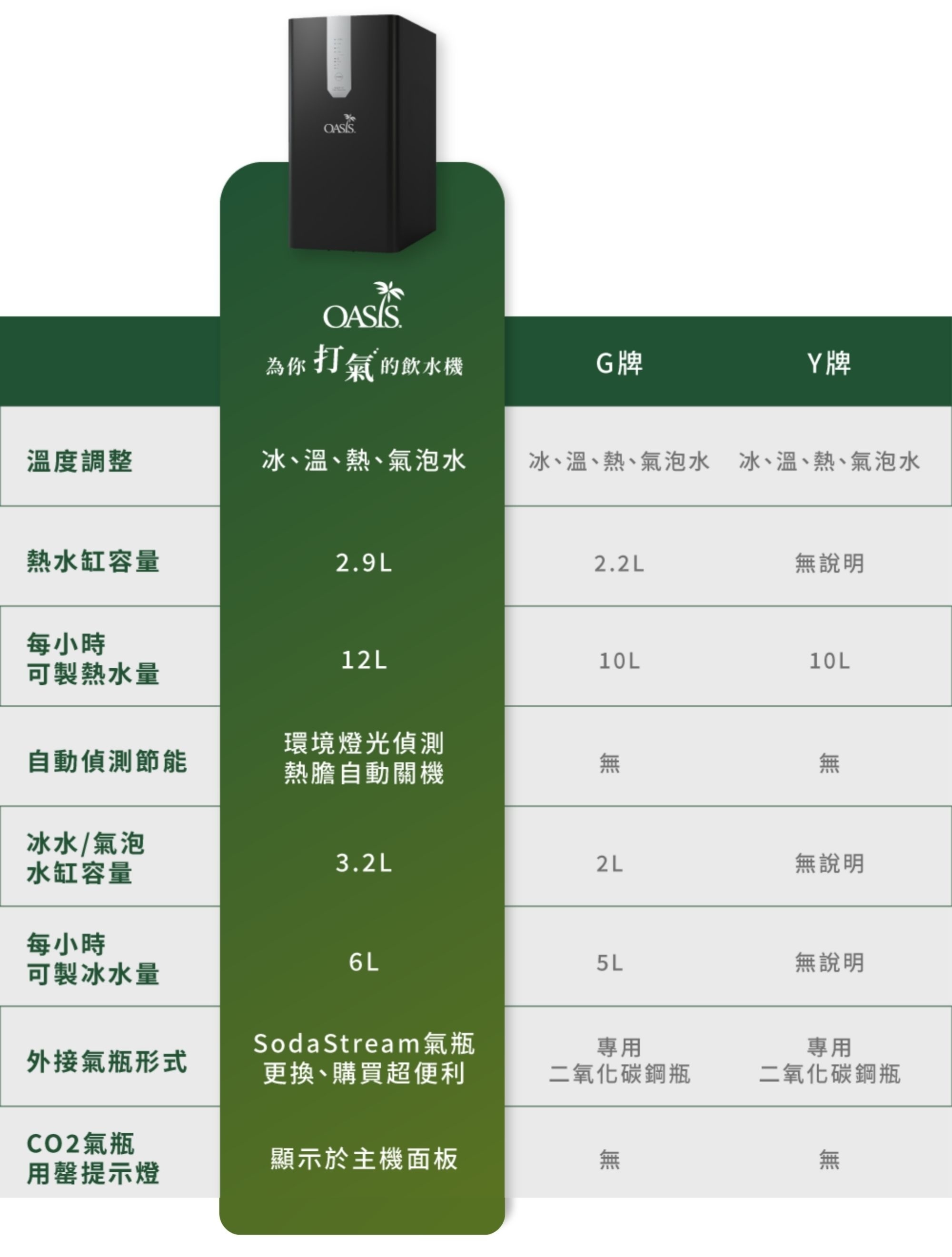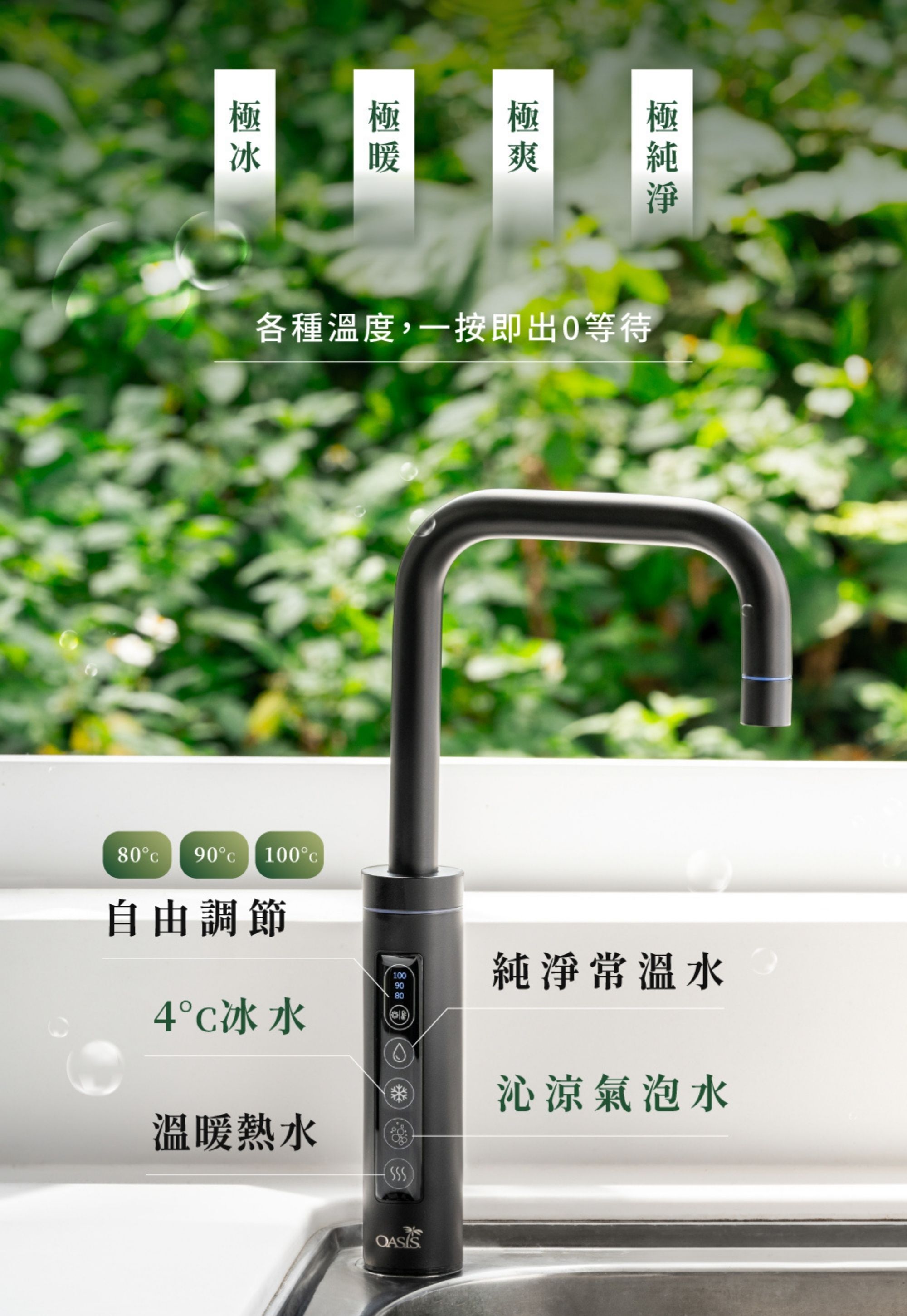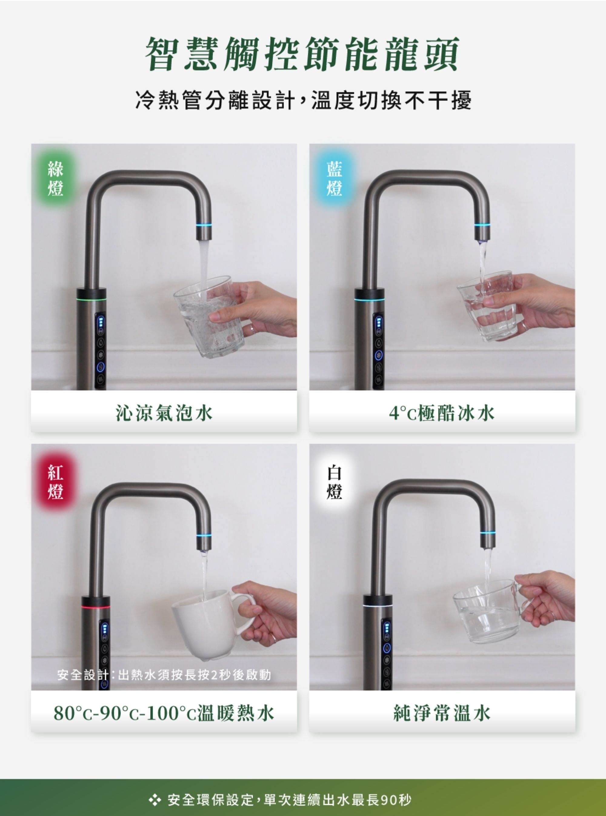 | 出水溫度 | 4℃ 氣泡水・4℃・常溫・80℃・90℃。100℃|即開即飲|切換熱水溫度需稍候 |